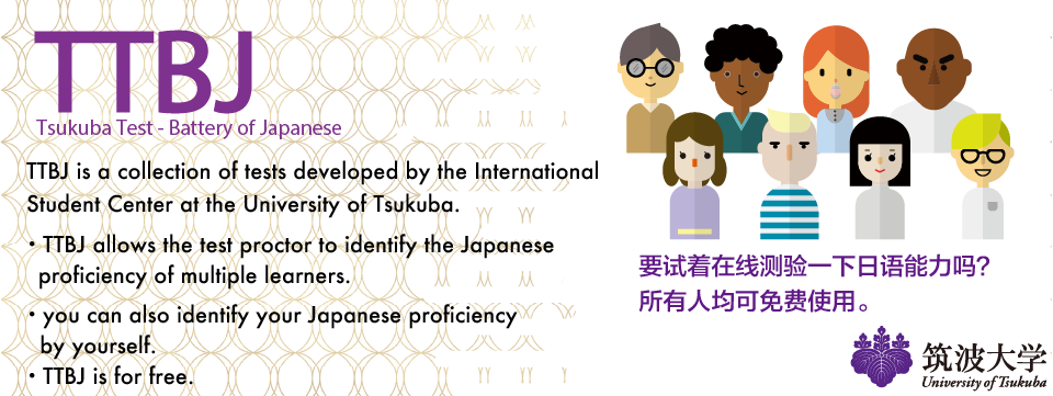 The TTBJ (Tsukuba Test-Battery of Japanese) is operated byThe Center for Distance Learning of Japanese and Japanese Issues within the Center for Education of Global Communication, the University of Tsukuba.