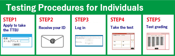The TTBJ is used by the University of Tsukuba as a placement test. For several years, the University of Tsukuba has been using the TTBJ Test for Individuals to sort more than 1,000 students into appropriate Japanese language class levels every year. We recommend asking students to take the set of tests individually and then present the results sent to them via PDF file to your learning institution. If you wish to use the TTBJ test in the same manner, please refer to the Test Manual, which is available on the website of the Japanese Language Education Division of the Center for Education of Global Communication, The University of Tsukuba (http://www.cegloc.tsukuba.ac.jp/data/doc/1467349914_doc_83_0.pdf).