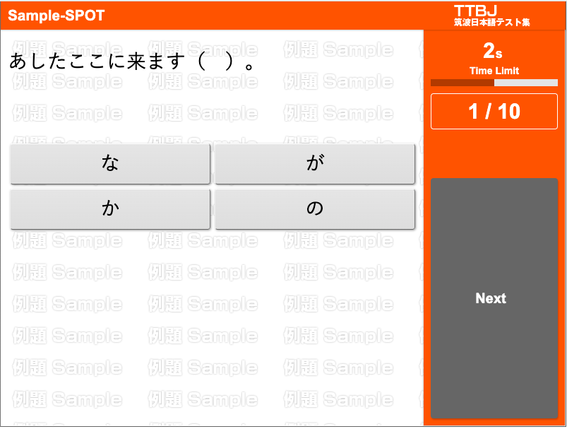 This test measures knowledge of grammar. Examinees select appropriate words to insert into blank spaces within sentences. The sentences are all unrelated, standing alone. Depending on the language level, furigana readings are written above difficult kanji characters. Grammar 90 is comprised of three sections, with 90 questions in total. The response time for each section (30 questions each) is 10 minutes, with a total response time of 30 minutes for the three sections. Examinees may answer the questions at their own pace. If an examinee encounters a question they cannot answer, they should click the → (Next) button to proceed to the next question, continuing on to the end of the test.